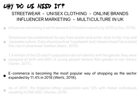 With the streetwear market forecast to grow, with the increase of luxury sales, a lot more brands will be adjusting to this trend. As E-commerce is becoming the most popular way of shopping as the sector expanded by 11.4% as of September 2018 (Wertz, 2018), it is evident that an online streetwear brand is needed in order to appeal to the younger consumer.